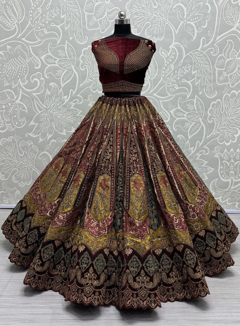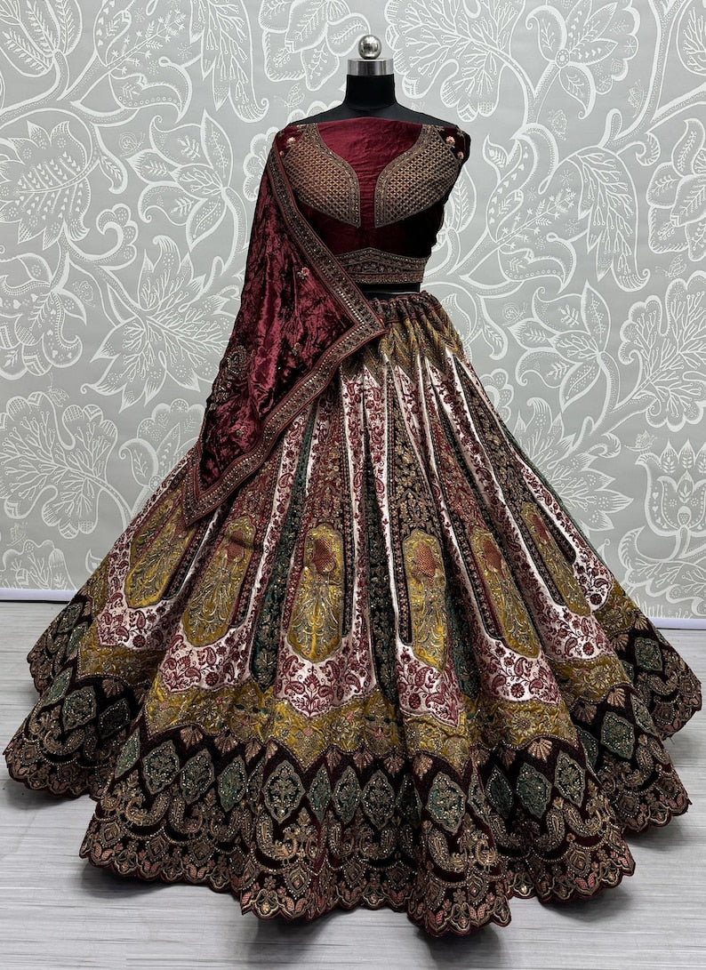 | Name | Traditional Wedding Bridal Embroidered Velvet Fabric Lehenga in Maroon Color |
