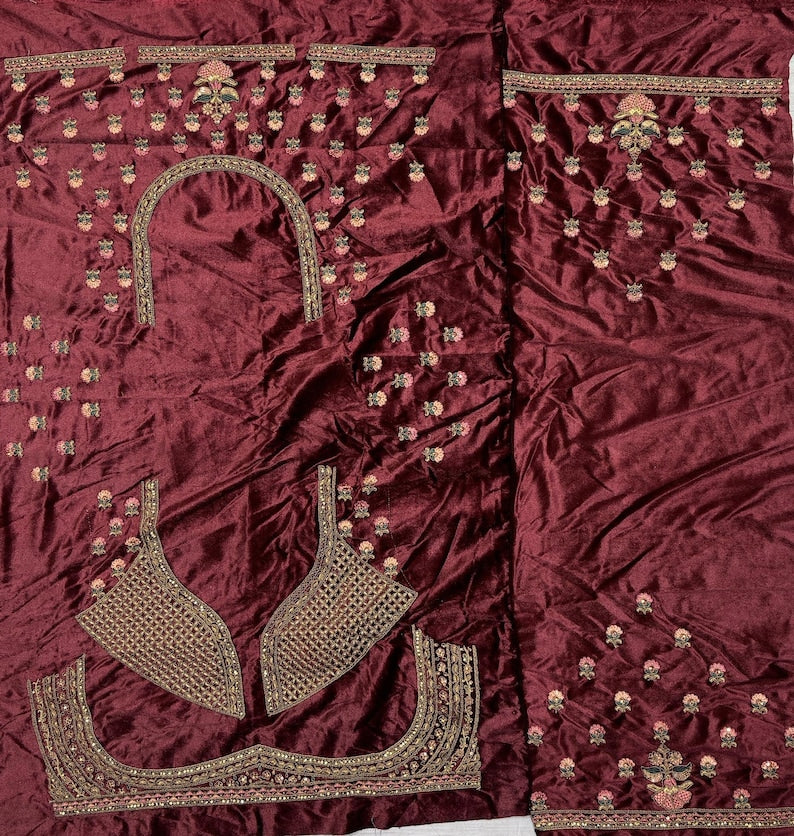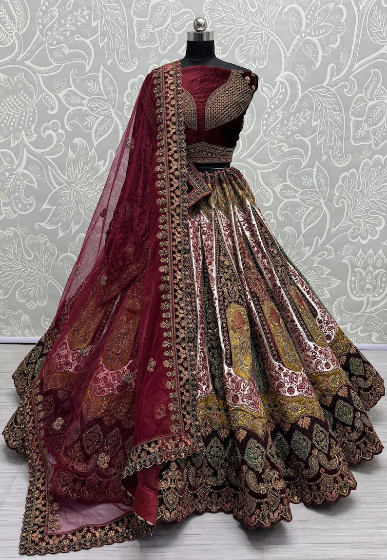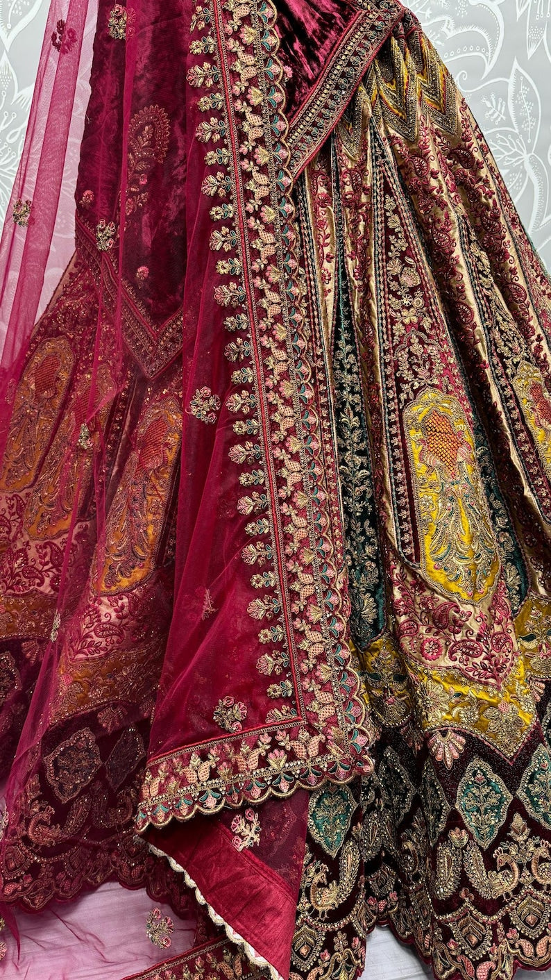 Crafted with meticulous attention to detail, this Maroon bridal lehenga features intricate embroidery that adds a touch of opulence to your special day. Made from high-quality Velvet fabric, it drapes beautifully and offers a comfortable fit. Whether you're the bride or attending a wedding, this lehenga will make you feel like royalty.