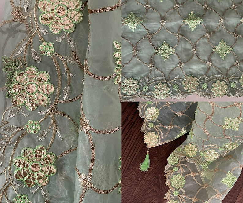 Sea-Green Duppatta: Slightly Stiff Organza all over trellis pattern , Gota patchwork flowers on the border and scattered all over