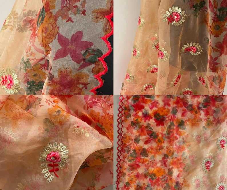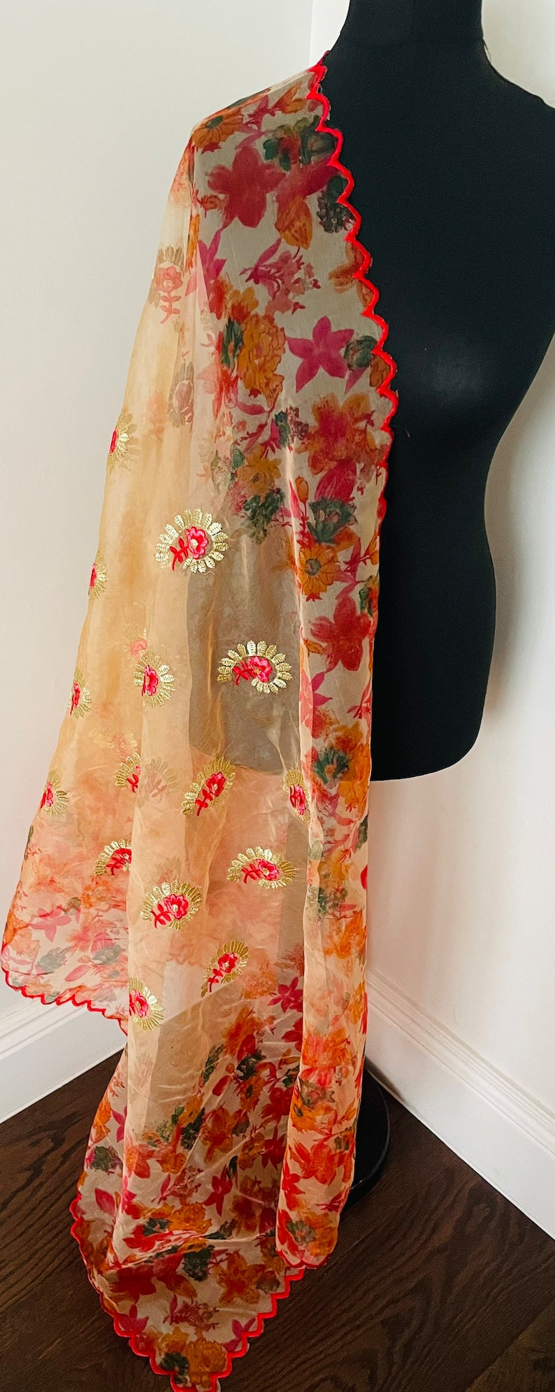 Orange Pink Dupatta: floral Printed all over with scattered flowers embroidered with silk thread and Zari thread all over the Dupatta.