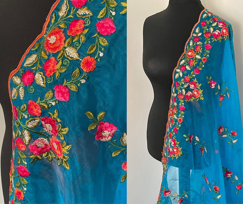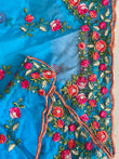 Firozi Blue Dupatta: flower embroidery all over, thick embroidered birder along the lengths, edges finished with orange scalloping