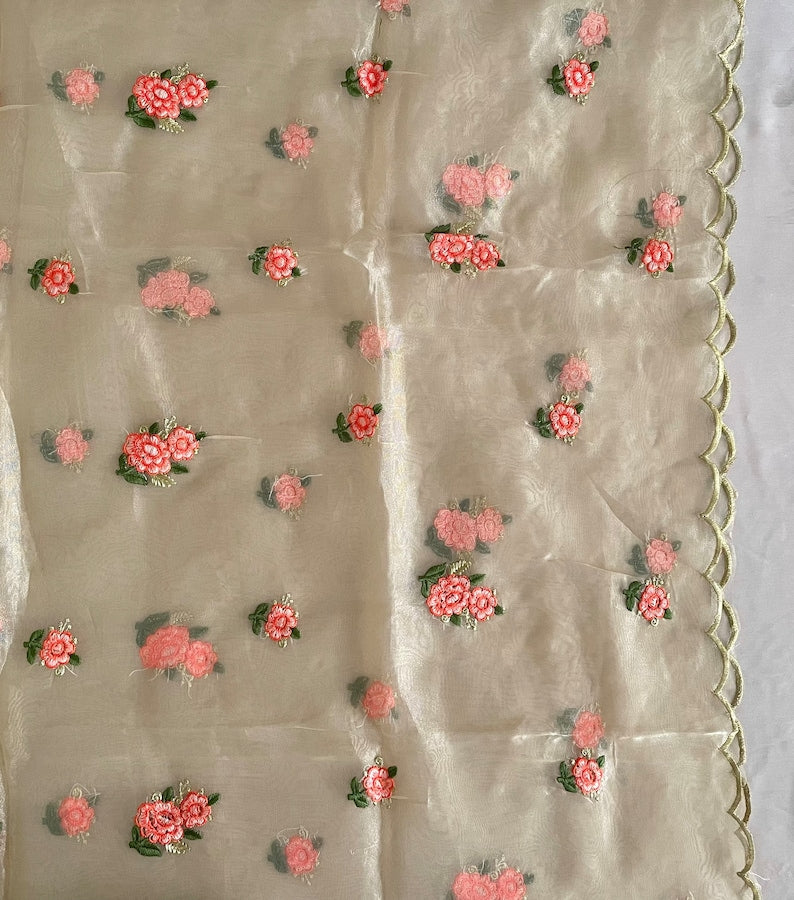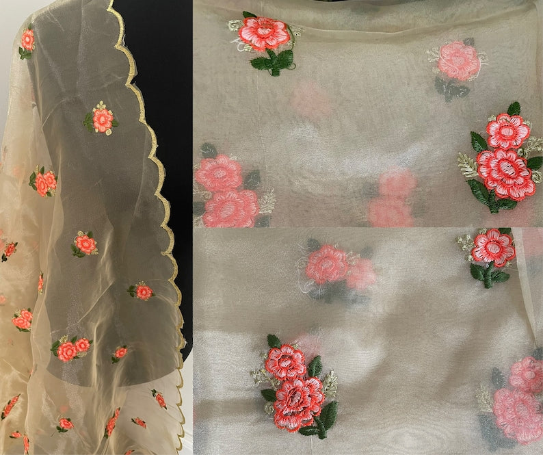 Golden Duppatta: with Dark and light peach/ green flowers all over the Duppatta, edges finished with scalloped gold Zari thread work