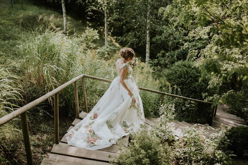 This unique wedding gown is handmade and is in one. Each flower is designed in a hand where more than 7m of fabric is used. Each lace is sewn by hand. The proce includes a petticot.
