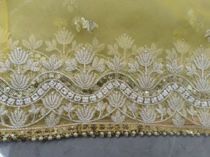 - Completing the ensemble is a vibrant Yellow Net Dupatta, meticulously designed with embroidered and sequin work. The sheer elegance of the dupatta adds a touch of glamour to the overall look, creating a harmonious blend of tradition and modernity.