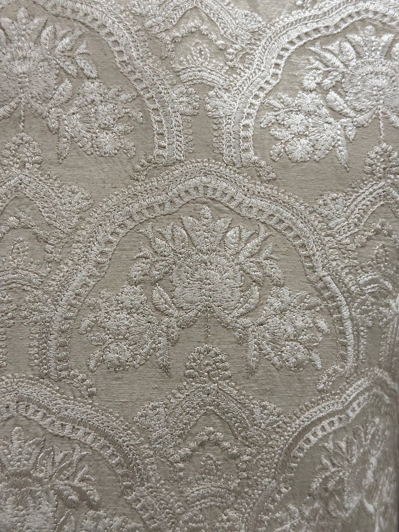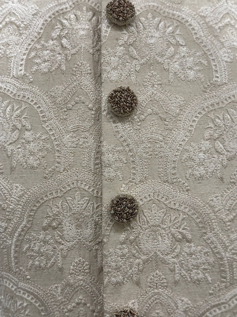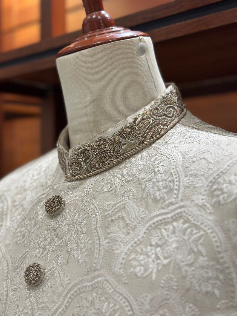 With this gorgeous white embroidered sherwani for men, you can really make a statement on your wedding day! It's a work of art! Beautiful embroidered floral patterns adorn the karandi base, and the ban and cuffs are embellished with hand-stitched zardozi designs. Various zari materials ensure a regal appearance by balancing the color scheme.