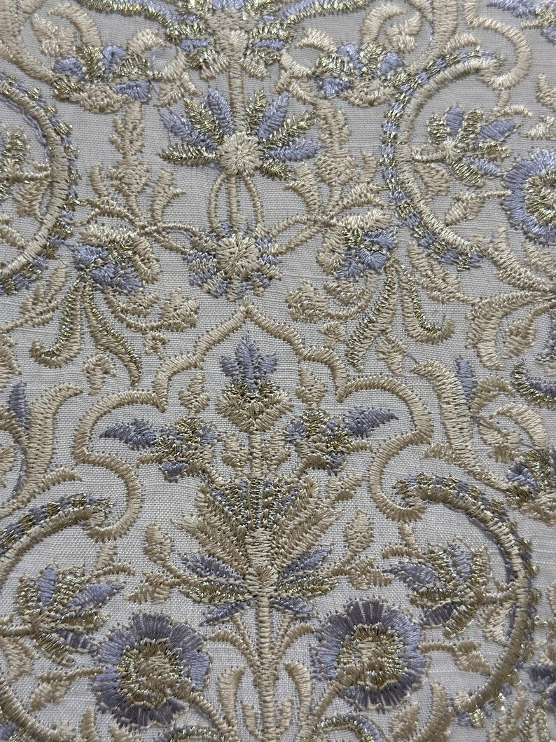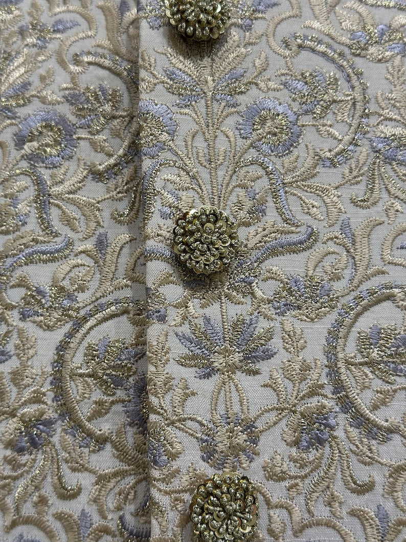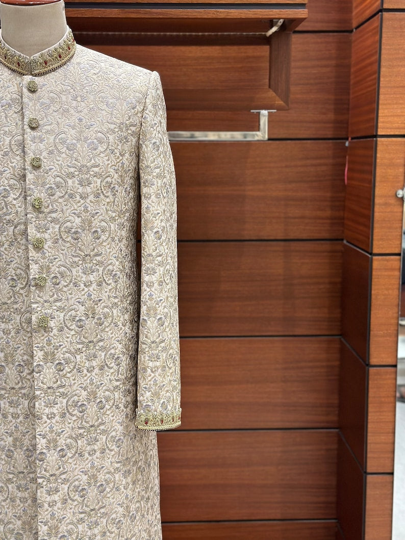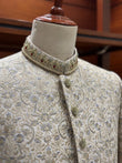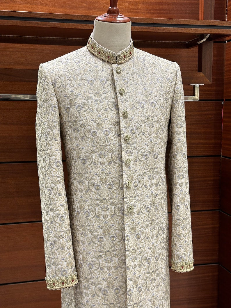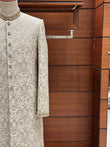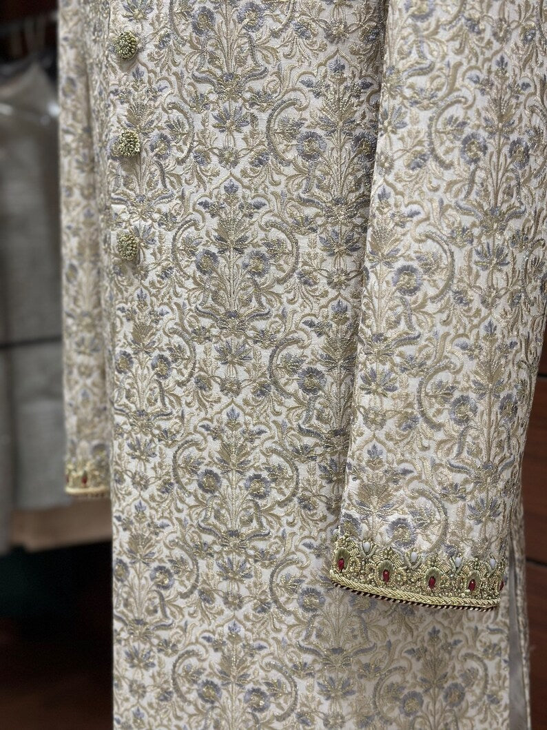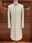 With this gorgeous white embroidered sherwani for men, you can really make a statement on your wedding day! It's a work of art! Beautiful embroidered floral patterns adorn the karandi base, and the ban and cuffs are embellished with hand-stitched zardozi designs. Various zari materials ensure a regal appearance by balancing the color scheme.