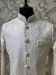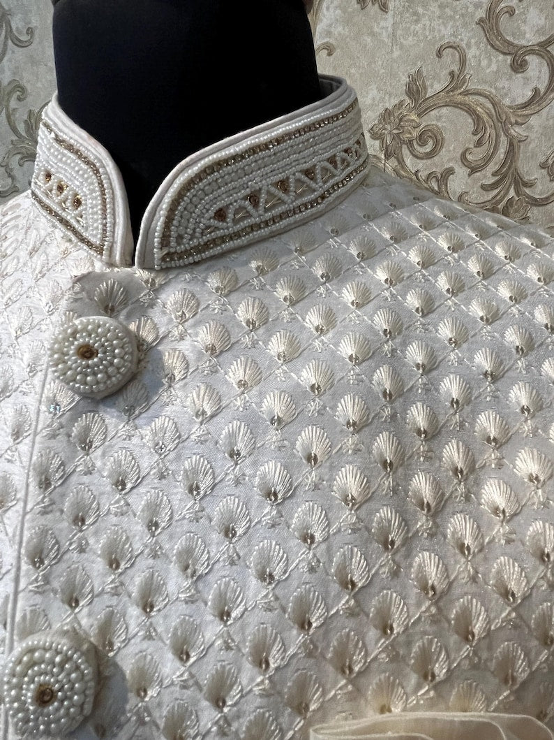 Product size guidance (a): please refer to chest size .This iridescent cream coloured sherwani set combines a traditional silhouette with contemporary elements to furnish a unique wedding outfit that is stylish yet customary.