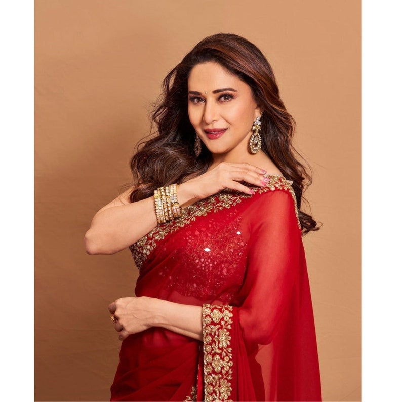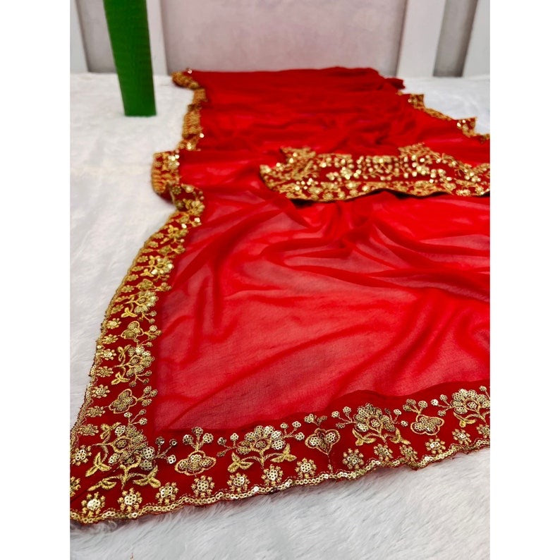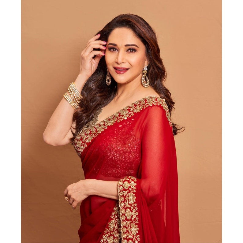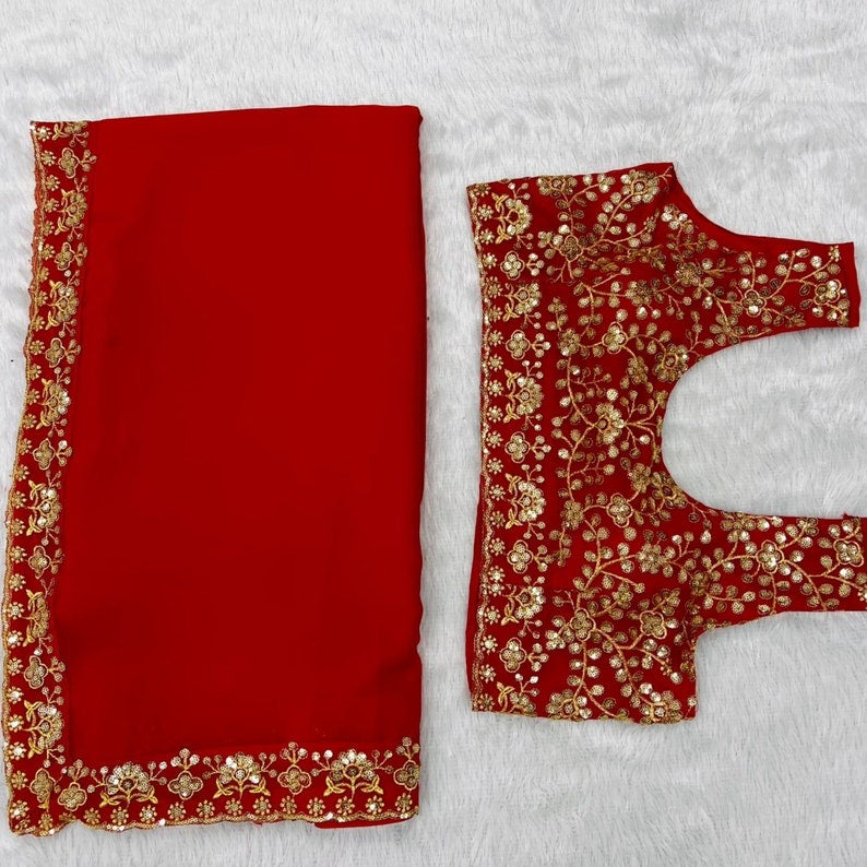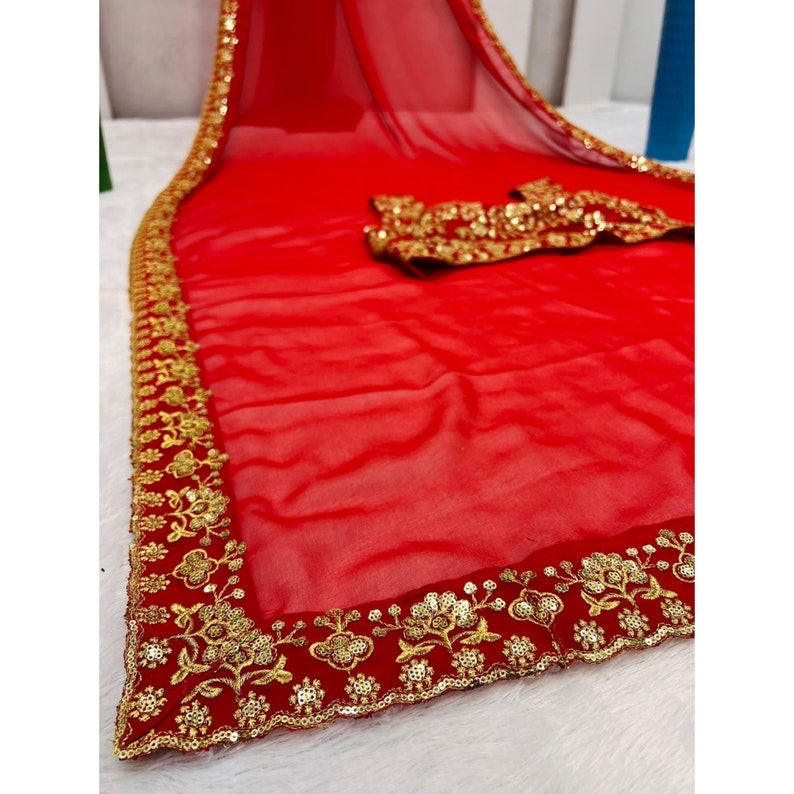 WOMAN KARVACHAUTH SPECIAL BANDHANI SUPERHIT TRENDING SOBHAGYAVATI BHAV EMBROIDERED SAREE WITH GEORGETTE FABRIC