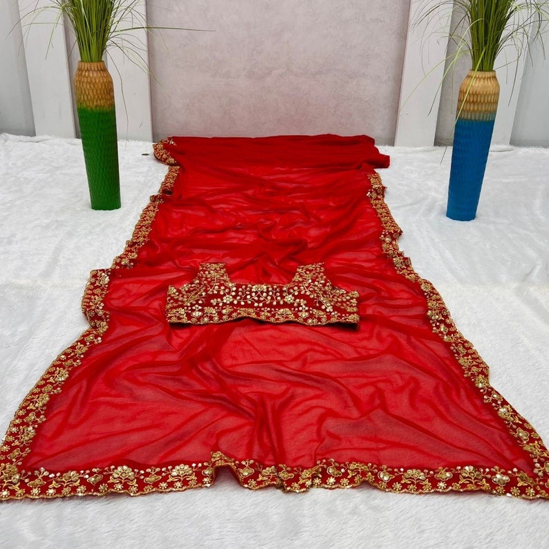 chinon silk saree with banarasi border and fancy tassels on pallu