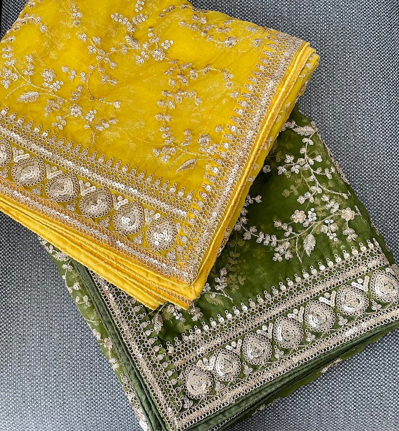 Organza fabric Duppattas with sequins and Silver Gold Zari thread embroidery all over, edges finished with crochet border. Broad Zari border along the length and slimmer border on the width